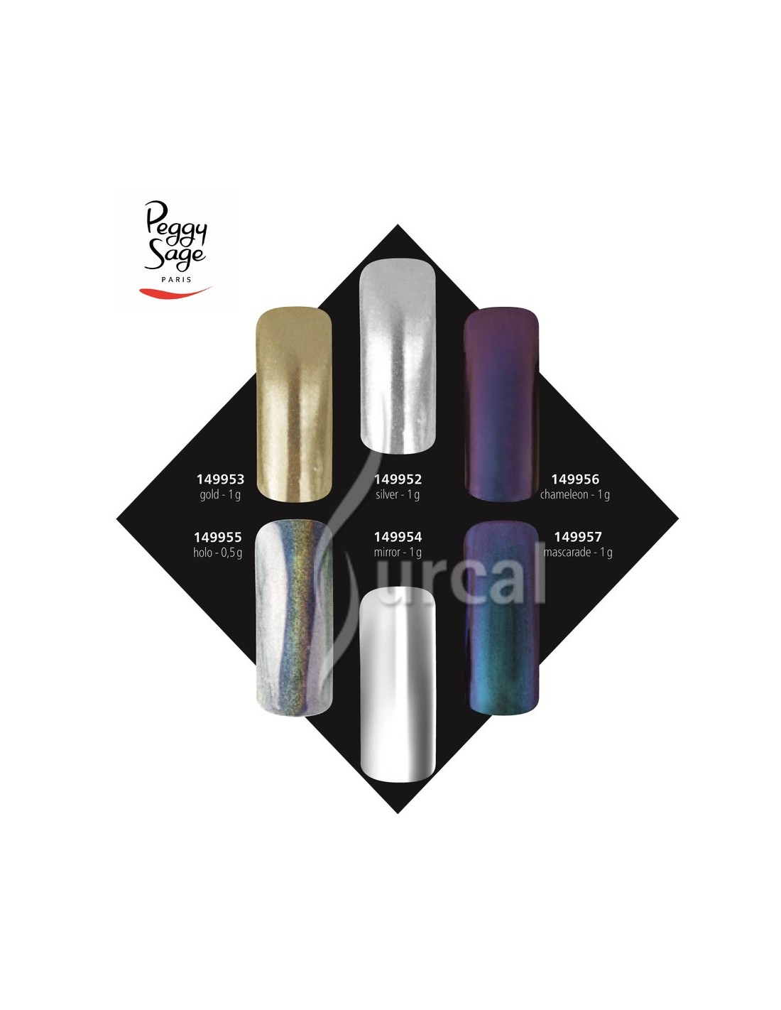 Con una gubia para empujar cutículas 300211, tomar los pigmentos deseados de la gama cromado Peggy Sage y colocarlos en la superficie de la uña. Efecto cromado espejo. Finalizar con una o dos capas de gloss sealer y catalizar.