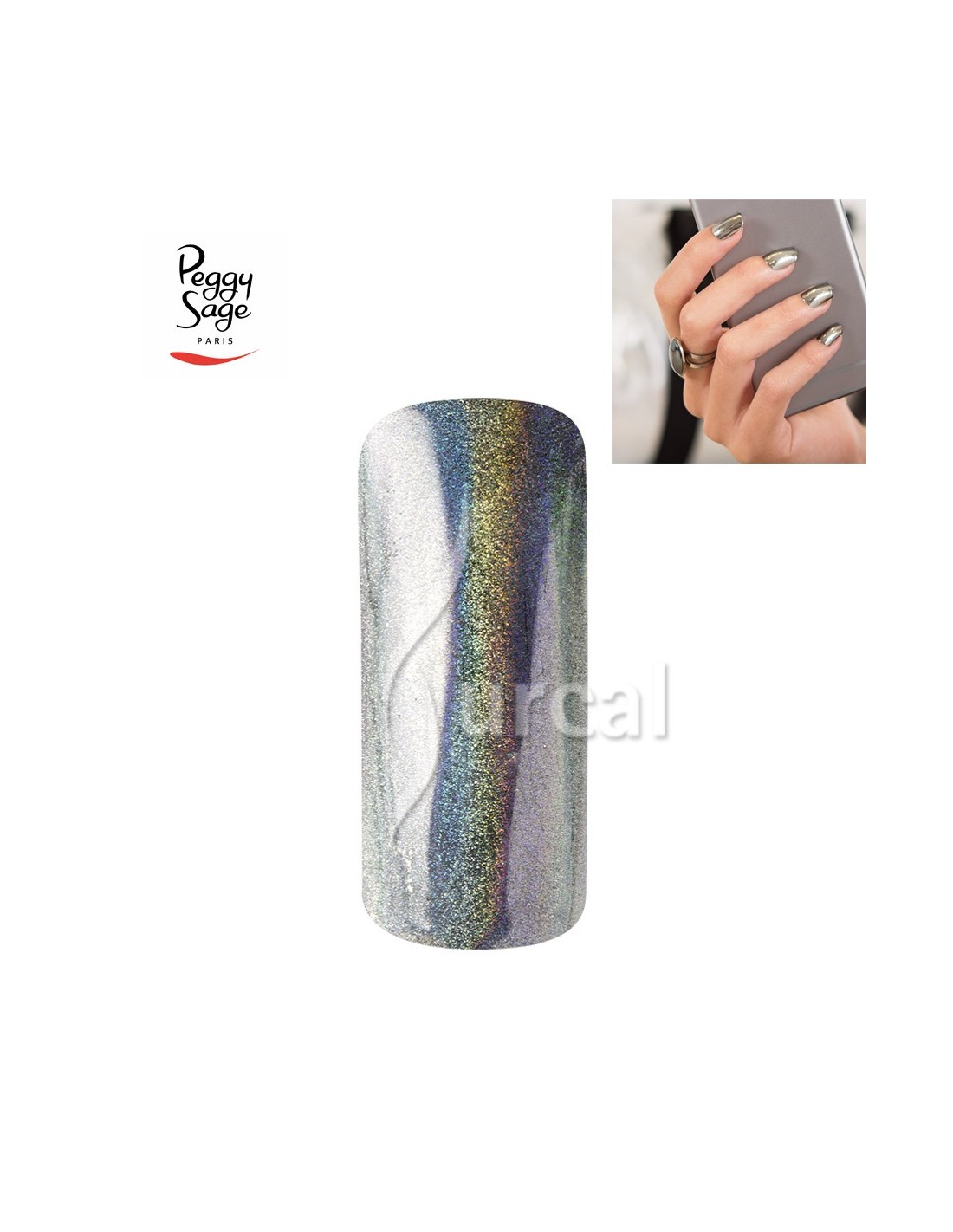 Con una gubia para empujar cutículas 300211, tomar los pigmentos deseados de la gama cromado Peggy Sage y colocarlos en la superficie de la uña. Efecto cromado espejo. Finalizar con una o dos capas de gloss sealer y catalizar.
